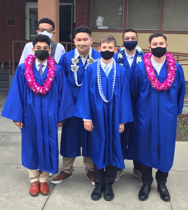 Graduates, I am so incredibly grateful and happy that I got to stand before you at your graduation ceremony. I am grateful because for much of this year, there was a computer screen between myself and all of you, and I am able to now have all of you here in front of me! I am happy because I am able to wish all of you success in person with a huge smile behind my mask. This year has been one of unprecedented firsts: the first 8th grade class spent mostly through distance learning; the first 8th grade class that took their HSPT exam virtually; and the first 8th grade class to persevere through all of these hardships to make it through to graduation. Not only did you all make it to this day successfully, but as you can see from our graduation awards lists, many of you made it with great distinction! Congratulations to all of you!